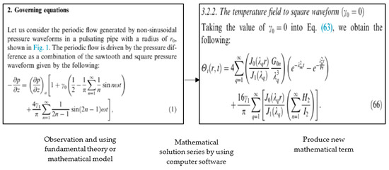 Data on document analysis furthermore confirm that scholarly output in the form of a mathematical expression that contributes to the specific field of theory is one of the remarkable outcomes. Figure 2 shows the evidence on processes that were recorded in a published article where a new term of heat flow in a pulsating pipe with radius r [34] was produced, which was derived by P1 and his research group.