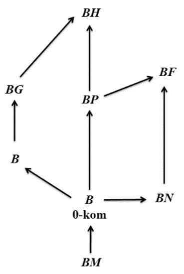 A BN-algebra that satisfies for all is said to be a BN-algebra with condition D. A. Walendziak introduced another special form of BN-algebra, namely, a BN1-algebra, which is a BN-algebra that satisfies for all (see [4]). Furthermore, the new QM-BZ-algebras were proposed by Y. Du and X. Zhang (see [5]). The relationship between B-algebra and BN-algebra is that every 0-commutative B-algebra is a BN-algebra, and a BN-algebra with condition D is a B-algebra. The relationship between a BN-algebra and other algebras can be seen in Figure 1.