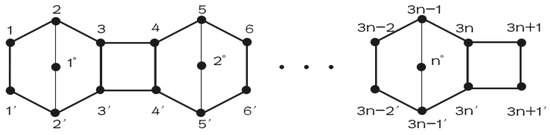A linear pentagonal chain of length n, denoted by , is a pentagonal chain with pentagons in which two pentagons with two edges in common can be regarded as adding one vertex and two edges to a hexagon. Wang and Zhang [19] obtained the explicit closed-form formulas of the Kirchhoff index of linear pentagonal chains. Wei et al. [20] made comparisons between the expected values of the Wiener index and the Kirchhoff index in random pentachains and presented the average values of the Wiener and Kirchhoff indices with respect to the set of all random pentachains with n pentagons. Recently, Sahir and Nayeem [21] derived closed-form formulas for the Kirchhoff index and the Wiener index of the linear pentagonal cylinder graph and the linear pentagonal Möbius chain graph. The study of hexagonal systems have attracted interest because they are natural graph representations of benzenoid hydrocarbon [22], and they have been of great interest and extensively studied; see [5,17,23].