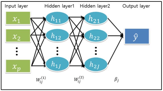 Below, we outline a framework of the DL model with a feed-forward neural network (FNN) architecture. We first describe an analytical form of the DL model. It consists of one input layer with p input nodes, L hidden layers with hidden nodes, and one output layer with K output nodes. For simplicity of argument, we consider the DL model with and . Then, the two hidden layers with p input variables ’s are given by the following forms [1]