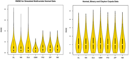 Table 1 shows that the GBM model is the best model for the multivariate normal distribution simulation case in terms of the median and IQR for RMSE and that the DL model is the best model for the combined non-normal simulated case with multivariate normal distribution, Clayton copula, and binary data in terms of the median for RMSE. Table 1 also shows that the NN model has the smallest maximum value of RMSE for the combined non-normal simulated data. These findings coincide with the results from [11,12] in that the DL and NN models for binary response data are more efficient than the PCAGLM with logit and PCA-GLM with probit models. The Violin plots in Figure 2 confirm that the GBM model for the multivariate normal distribution simulation case is superior to the DL, NN, DLk, POI, ZIP, and NB models in terms of the median and IQR, and the DL model for each non-normal combined simulation case with multivariate normal, Clayton copula and binary shows a superiority over the NN, DLk, GBM, POI, ZIP and NB models in terms of the median.