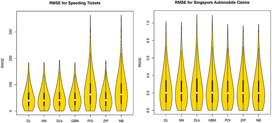 For the two real datasets, we take a random sample of 800 observations from the real data observations with 1000 repetitions. We compute the RMSEs with the predicted values from the DL, NN, DLk, GBM, POI, NB, and ZIP models and 20% testing data for the two real data cases in Table 4. Table 4 shows that the DL model is the best model for the large size speeding ticket dataset in terms of the median for RMSE and that the NN model is the best model for the smaller size Singapore auto claims dataset in terms of IQR. This may be because large real insurance-related datasets can follow a multivariate non-normal distribution. These results coincide with the result of the multivariate non-normal simulated case shown in the Table 1. Violin plots in Figure 3 confirm that the DL model has the smallest maximum value of RMSE and is superior to the NN, DLk, GBM, POI, ZIP, and NB models in terms of the median. The DL model was built with double hidden layers with (2,2) neurons, and the NN model was built with a single hidden layer with two neurons for each real datum. For the real data analysis with the DLk model, we set the same settings as the DL and NN, with double hidden layers with (2,2) neurons.