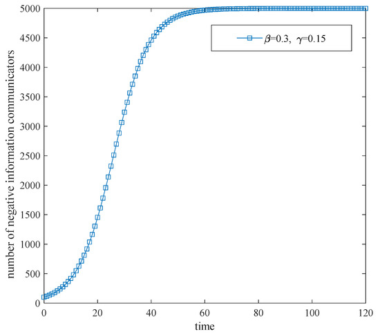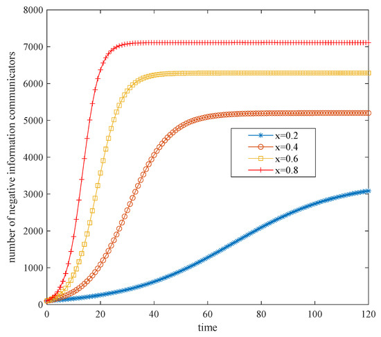 In Figure 5, the negative emotion x is set to 0.2, 0.4, 0.6, and 0.8 according to the sequence of equal differences. This trend shows the influence of different negative emotion thresholds on the speed of public opinion. In Figure 5, it can be inferred that the higher the negative emotion is, the higher the growth rate of the number of negative information communicators will be. However, no matter how large the level is, it will reach the upper limit, and thus it will enter a stable period. After that, it will turn into a stable period, which means that the spread of COVID-19 public opinion will reach a stable state in a short period of time. In Figure 5, when the negative emotion level is above 0.2, the number of negative information communicators is positively correlated with the level value. As the negative emotion x increases, the amount of negative information communicators along with the speed and intensity of public opinion diffusion will be increased. When the negative emotion level is below 0.2, the base of communicators will be small. This means that at this level, the activity of COVID-19 public opinion dissemination continues to weaken, and the movement of public opinion dissemination gradually stops over the time. Consequently, the supervision of negative emotions plays a crucial role in the prevention of public opinion. Through a variety of measures, the level of negative emotions and users’ information anxiety should be reduced. Only in this way can public opinion avoid being aggregated and evolved into a high-risk diffusion stage.