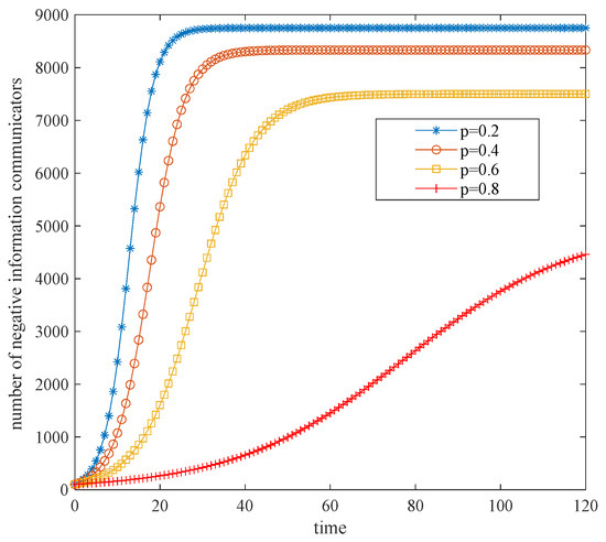 In Figure 4, due to the positive emotion p ∈ [0, 1], the positive emotion p is set to 0.2, 0.4, 0.6, and 0.8 according to the sequence of equal differences. Figure 4 shows the influence of different positive emotion thresholds on the speed of the public opinion spread. It can be inferred that the increase in the level of positive emotion will inhibit the spread of negative public opinion and reduce the number of negative information communicators. The greater the number of positive emotions, the less vigorous the spread of COVID-19 public opinion. This means that public opinion is gradually attenuated, and the scope of diffusion is gradually shrinking. Simultaneously, when the positive emotion level p is higher than 0.8, the number of negative information communicators is more moderate than other levels. This shows that the intensity of public opinion dissemination activities is weak, and the positive emotions is negatively correlated with the scale of public opinion dissemination.