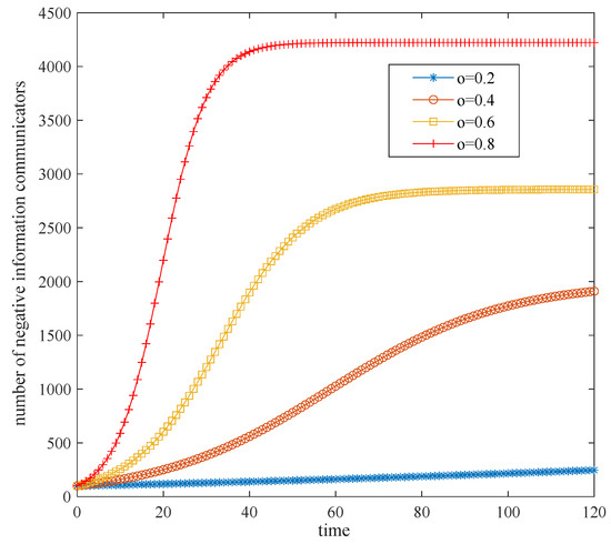 In Figure 6, the neutral emotion o is set to 0.2, 0.4, 0.6, and 0.8 according to the sequence of equal differences. The figure shows the influence of different neutral emotion thresholds on the speed of public opinion spread. Figure 6 indicates that the neutral emotion can possess a susceptibility tendency, and this is consistent with the mechanism of negative emotion. In detail, the higher the neutral emotion is, the higher the growth rate of the number of negative information communicators will be. When the neutral emotion level is above 0.4, the number of negative information communicators is positively correlated with the level value. As the neutral emotion o increases, the amount of negative information communicators along with the speed and intensity of public opinion diffusion will be increased. When the neutral emotion level is below 0.2, the base of communicators will be small, and gradually decreases to 0. According to the analysis of Figure 4 and Figure 6, it is evident that the thresholds for positive and neutral emotion are 0.8 and 0.2, respectively. That is to say, we should try our best to guide neutral emotions, and to change the negative emotions to positive emotions. When the ratio of positive emotions to neutral emotions is higher than 4:1, the spread of COVID-19 public opinion can be controled. Only in this way will users change from facilitators of bad public opinion to promoters of the inhibitory factor. Thus, the goal of reducing the threshold and the number of communicators can be achieved, thereby effectively preventing and controlling the spread of COVID-19 public opinion.