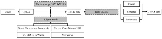 The subject words of the microblog content regarding COVID-19 are “novel coronavirus pneumonia”, “corona virus disease 2019”, “COVID-19 in Wuhan”, and “new crown”. These words contain four types of search terms related to the COVID-19 pandemic in Sina Weibo. By crawling through the data of the subject words, we obtained 44,542 data points. Through manually deleting invalid, repeated, and irrelevance texts in this data, we finally obtained 37,998 data points.