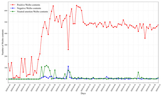 With the rapid development of social media technology, information dissemination is characterized by diversification, timeliness, and decentralization. Weibo is an important news platform for sharing information and discussing social news [1]. COVID-19 is a new human pathogen caused by a coronavirus of the respiratory syndrome, which was identified in Wuhan, Hubei province [2]. The World Health Organization (WHO) classified COVID-19 as a novel Coronavirus on 18 January 2020 [3]. It is a public health emergency with a huge impact on the world. The suddenness and seriousness of COVID-19 have caused a variety of public opinions on social media. For example, on 6 February 2020, the news of the death of Dr. Li Wenliang triggered an expression of public opinion, which lead to a sharp drop in positive emotions and to negative public opinion flooding the public opinion field. In the process of gradually recognizing COVID-19, various hot topics related to COVID-19 on Weibo remain high, and a variety of voices appear in the public opinion field. The particularities of the public health emergency have created a lot of negative public opinion (e.g., rumors, false news, and negative emotion). Therefore, it is an important and interesting topic to focus on how to prevent and guide COVID-19 public opinion.