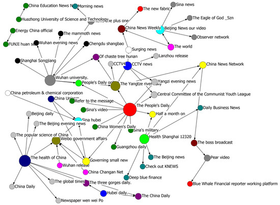 The centrality of the dissemination of public opinion subjects is analyzed in Table 3; the top five dissemination subjects of the dissemination nodes are “People’s Daily”, “State-owned Assets Xiaoxin”, “Changjiang Daily”, “Weibo Government Affairs”, and “Healthy China”. The centrality of the “People’s Daily” is 888.333, indicating that “People’s Daily” has the strongest ability to guide information dissemination. This means that most subjects need to use it to spread public opinion. The media affiliation “People’s Daily” thus belongs to the core subject of information dissemination. In addition, official media such as “State-owned Assets Xiaoxin”, “Changjiang Daily”, “Weibo Government Affairs”, and “Healthy China” also have a high status as communication centers. Furthermore, from an overall point of view, only “Boss Hookup” and “Pear Video” belong to self-media. This shows that the official media generally disseminated information quickly to prevent an information “vacuum” during the COVID-19 pandemic, promoting the openness and transparency of incident information. They lead the overall public opinion to be positive, so that the positive public opinion occupies the mainstream position in the public opinion field of the whole event.