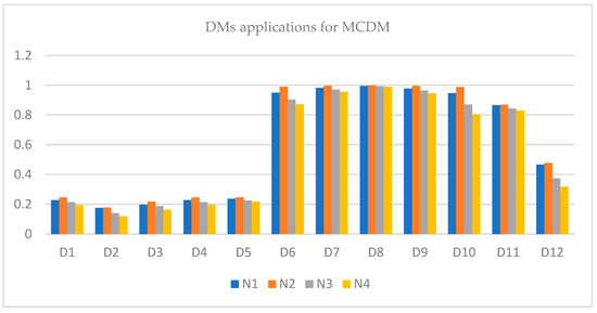 The outcomes of Table 11 are portrayed in Figure 7, which shows that after applying the proposed DMs, is the best choice for MCDM purposes.