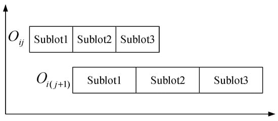 Following the above scheduling scheme, the start times and completion times of all sublots in each operation can be determined in the decoding process. For each sublot , it cannot be processed until some necessary conditions must be satisfied: (1) The assigned machine of must be available, and the available time is represented by ; (2) If , can be immediately started once the assigned machine is available, i.e., ; (3) If , must be started after is finished and then transported from machine to , i.e., . The completion time of can be measured by .