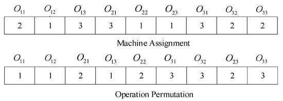 Similar to other meta-heuristics, one of the key issues is to design an encoding approach to implement the conversion between the solution space and the search space. In this paper, the problem is contained by machine assignment (MA) and operation permutation (OP). To represent the scheduling solutions, an encoding scheme with two vectors is employed to indicate the information of MA and OP. In the MA vector, a machine is chosen from the compatible machine set of each operation. In the OP vector, operations are sequenced to represent the precedence relationships on machines.