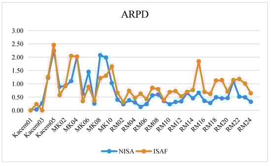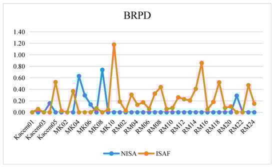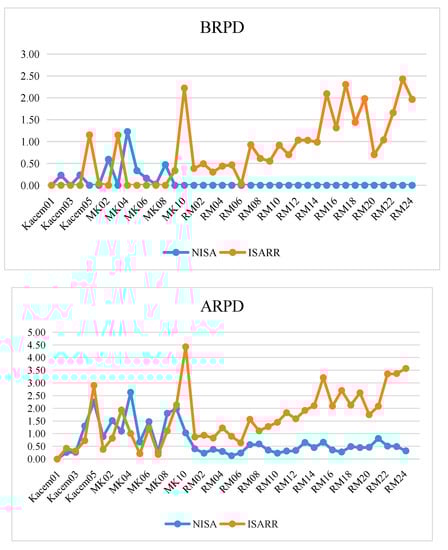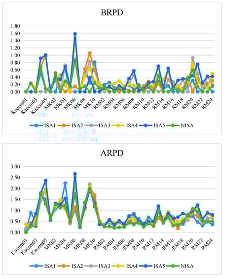 To cooperate the abilities of exploration and exploitation, a linear adjustment approach of is employed to divide individuals into two groups. In this subsection, we validate the effectiveness of the dynamic adjustment approach based on the comparison between NISA and ISAF. In the ISAF, is set as the recommended value in [], i.e., = 0.2. It can be clearly observed from Table 6 that: (1) In comparison to the Best values, NISA performs better than ISAF in 34 out of 39 instances. (2) In comparison to the Avg values, NISA is superior to ISAF in 33 out of 39 instances. (3) In comparison to the Time value, the running time of NISA is less than that of ISAF in 19 out of 39 instances. (4) The Mean value also demonstrates the superior performance of the NISA algorithm. In addition, the curves of BRPD and ARPD are shown in Figure 6. According to the results in Table 6 and Figure 6, it can be concluded that the dynamic adjustment strategy on is also effective for the considered problem.