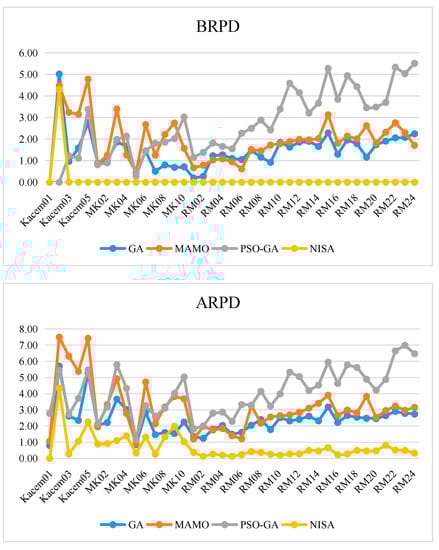According to the comparison results in Table 7, the following observations can be obtained: (1) In comparison to the Best values, NISA outperforms the other three algorithms in 38 out of 39 instances. (2) In comparison to the Avg values, NISA performs best in 38 out of 39 instances. (3) In comparison to the Time value, GA performs best among the four algorithms. (4) The last row suggests that the proposed algorithm can obtain better computational results, but it consumes more time than GA and MAMO. The curves of BRPD and ARPD are shown in Figure 7. According to the results in Table 7 and Figure 7, it can be concluded that the NISA algorithm is effective in solving the considered problem.