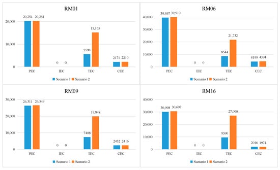 In this subsection, two scenarios with different levels of transportation times are used to investigate the effect of transportation times. For two scenarios, transportation times are randomly generated with two discrete uniform distributions U [,] and U [,], respectively. Table 8 reports that TTEC increases along with the increase in transportation times. In addition, four instances (RM01, RM06, RM09, RM16) are taken as examples, and the histograms of energy consumption are shown in Figure 8. It can be easily seen that the increase in TTEC is mainly attributed to the increase in TEC. It can also be inferred that the increase in transport times does not have a great impact on the other three kinds of energy consumption.