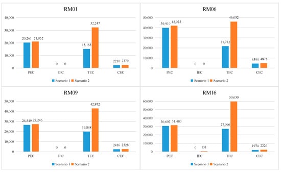 In this subsection, two scenarios with different levels of sublot number are employed to analyze the effect of the sublot number. In the two scenarios, sublot numbers are randomly generated with two discrete uniform distributions U [,] and U [,], respectively. Table 9 indicates that TTEC increases along with the increase in the sublot numbers. In addition, for four instances (RM01, RM06, RM09, RM16), the histograms of energy consumption are shown in Figure 9. It can be easily observed that the increase in TEC is largely responsible for the increase in TTEC. It can also be inferred that the increase in sublot number has a relatively small effect on the other three types of energy consumption.