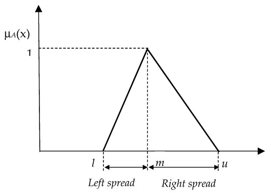 where l, m, and u are left endpoint, mode, and right endpoint, respectively. Triangular fuzzy numbers (TFNs) can also be expressed by their triplets (l, m, u), as shown in Figure 1.