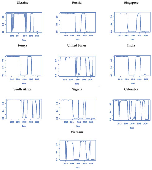 In addition, to confirm and illustrate the structural change in the markets and economies of ten countries, we plot the filtered probabilities of Regime 1 obtained from the MS-VAR model. Figure 2 shows the filtered probability of Regime 1 or stable market regime for all ten countries from January 2010 to March 2021. The probability varies between 0 and 1. When the probability is close to 1, the market state is classified as Regime 1. In contrast, when the probability is close to 0, the market state is classified as Regime 2 [73,74].