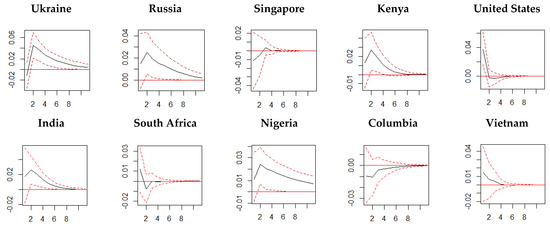 Figure 3 and Figure 4 illustrate the impulse response of Bitcoin to the one-standard-deviation shock of inflation for Regimes 1 and 2, respectively. We find that the responses of Bitcoin to shocks in inflation are a bit different across the two regimes. The responses of Bitcoin to inflation shocks are much stronger in the stable regime (Regime 1) than the turbulent regime (Regime 2), as the peak response values of Bitcoin to inflation shocks range from 0.01 (Columbia) to 0.05 (Vietnam) basis points in month two. In contrast, in Regime 1, the response values range from −0.01 (Colombia) to 0.04 (Ukraine) basis points in month two. Overall, in Regime 1, Bitcoin could be useful to hedge against inflation in the short run in all countries except for Columbia; the response of Bitcoin against the inflation shocks of these countries is positive and reaches the highest in month two, and it falls gradually after this month, then tapers off to near zero by months 8–10. Notably, in Columbia, bitcoin can hedge against inflation only in the first two months and lost its ability to hedge in the third month and converged to the original state in eight months.