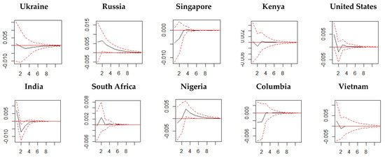 Considering other assets—oil, gold, and stock—the impulse response illustrations are provided in Figure 5, Figure 6, Figure 7, Figure 8, Figure 9 and Figure 10. Figure 5 shows the impulse response of stock to the inflation shock in Regime 1. The stock return of each country responds to inflation shock differently. In the case of Russia and South Africa, the stock return can hedge against inflation shocks in the short run for eight months and five months, respectively, before converging to their original states. On the other hand, the stock can only partially hedge against inflation shocks for India and Vietnam. Specifically, the stock can only hedge against inflation for one month and no longer has the hedging potential from the second month. In the United States, the ability to hedge against inflation in the short run is unstable. When there is an inflation shock, it can hedge against inflation in the first two months. Then, during the third month, the stock loses its ability to hedge. However, after the fourth month, the stock index resumes its ability to hedge against inflation shocks and returns to its long-run state in eight months. In Ukraine, Singapore, Kenya, and Columbia, stock indices cannot be used for inflation hedging against inflation shocks.