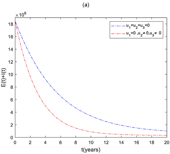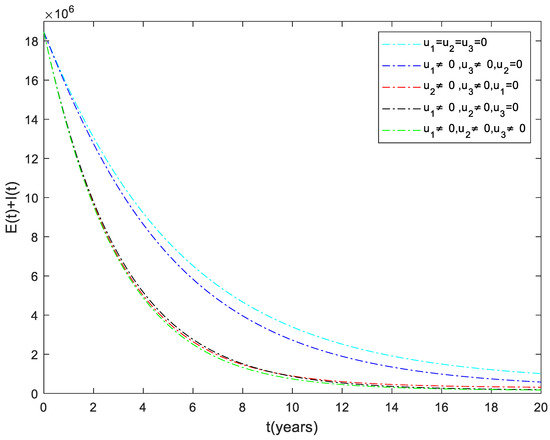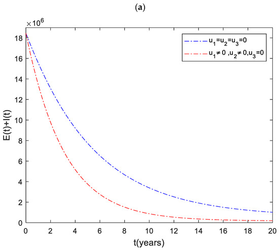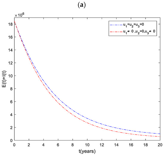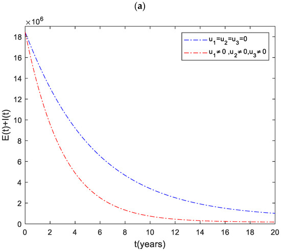 The dynamics of the total infected population () are shown in Figure 1. It can be observed that the number of infected individuals can be significantly decreased when the three control inputs ( and ) are used simultaneously. Like Strategy , Strategies and play a significant role in reducing the number of high-risk latent individuals. In contrast, Strategy has the least impact on reducing the number of patients. This shows that it is beneficial to use case finding control in combination with other strategies to prevent the disease.