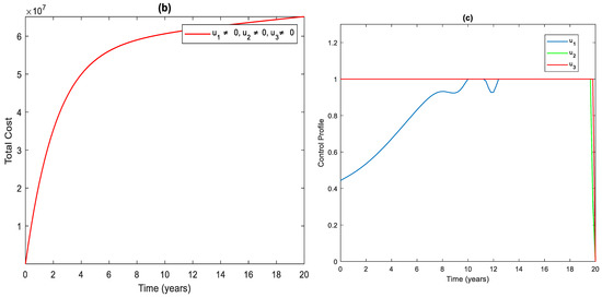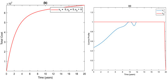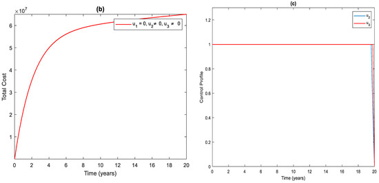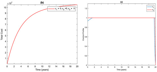 Figure 3a shows the significant difference in the numbers of the total infected population with control and without control. More precisely, the total number of infected people with and without controls at the end of the simulation period is and , respectively. To achieve this, the control profile and should be implemented at a maximum (Figure 3c). The cost function for this strategy is shown in Figure 3b. The total cost when the strategy is implemented throughout the simulated time horizon is .