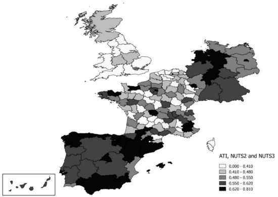 The results confirm previous studies in the literature, giving an innovative approach by applying the methodology based on the fuzzy set theory. At the country level, the countries showing the highest ATI values are the countries of the Iberian Peninsula and Germany. At the same time, the United Kingdom and Belgium represent the group of countries with negative attitudes towards immigrants. At the territorial level, a capital effect is highlighted, as the capitals of the countries analysed tend to have more positive ATI than the average of the respective country. Finally, a duality between the Balearic Islands and Corsica has been pointed out. The Spanish archipelago, driven by the nexus between tourist and migratory flows [24], has built a multicultural society tolerant of immigrants [55], while Corsica, which has invested less in tourism, presents more hostile attitudes.