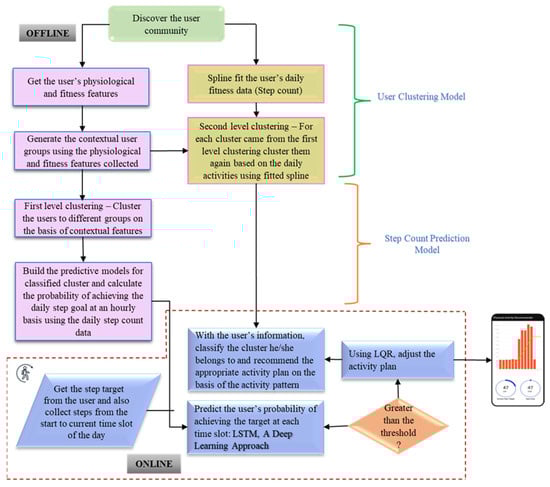 In first-level clustering, agglomerative hierarchical clustering groups users into contextual groups according to their physiological and calculated physical features. Agglomerative clustering is easy to implement, and it works on the basis of the dissimilarities between the objects to be grouped. The silhouette score was greatest for three clusters; hence, three contextual groups were chosen for the dataset. For the user group classification model, we used the random forest ensemble algorithm. For the partial features classification model, we attained an accuracy of 0.82, whereas, for the complete features classification model, we attained an accuracy of 0.97. The model was spline-fitted and used for second-level clustering, again using agglomerative hierarchical clustering, this time to group users according to daily activity. These clusters were used for the online part of the project. For the predictive model, the deep learning approach LSTM had the highest accuracy of 97.8%, followed by other algorithms such as SVM, RNN, and random forest with accuracies of 86.18%, 92.33%, and 94.47%, respectively. When the LQR model returned a value of 0, the users are recommended changes in their activity plan. The whole process was developed into an Android application to make it more user-friendly. Incorporating a drift detection and an automated model into the framework represent potential future improvements. Issues related to data security should also be addressed.