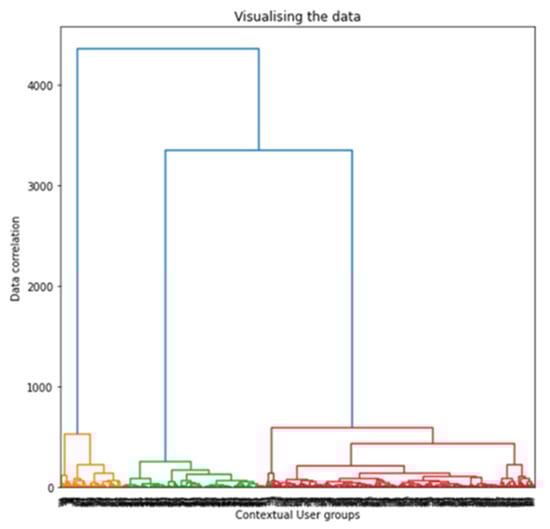 The initial level of clustering was employed to identify different contextual end-user groups. The accumulated and merged in-text features received were used as input to the first-level clustering. The output of first-level clustering divided the overall discovered end-user population into many clusters according to similar contextual features. We used hierarchical agglomerative clustering [37] to cluster users into different in-text groups. This clustering method is popular in splitting the given data structured on their likeness. This algorithm takes each object to be a singleton cluster. Since the contextual features were divided using the user’s data similarity, we used hierarchical agglomerative clustering.
