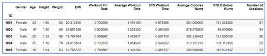 Due to improvements in technology such as digital watches and mobile phones that can more precisely forecast data, collecting real-time statistics with high precision has become simple. Physical activity or step count numbers and physiological characteristics were included in this dataset. The physiological aspects included the user’s height, weight, gender, body mass index (BMI), and age. The physical activity dataset contained each individual’s hourly step count value for 42 days. Contextual factors were a combination of physiological and physical characteristics such as the number of training sessions, average workout time, and average calories burned per session.