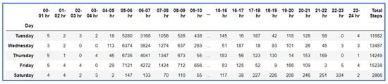 These features were used to determine the adherence to the physical activity routine, as well as to personalize recommendations. Furthermore, the user’s daily and hourly step counts, the calories burnt, and the physical features were entirely calculated. The sample data for physical features are given in Table 2, while sample data for physiological features are given in Table 3. These data might be inconsistent due to their healthcare characteristics. Thus, preprocessing was required to make the data consistent by removing impurities, missing values, and outliers, allowing the data to be used for further computations.
