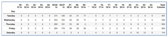 The physical feature dataset consisted of the step counts and calories burnt for 533 users over 42 days. Among the 533 users, 290 were male, while 243 were female. The step count dataset contained the hourly step count of each user for 42 days indexed on a daily basis. The calories burnt dataset was analogous to the step count data. Figure 4 shows the sample step count data, while Figure 5 shows the corresponding calorie data of the user over 5 days. Figure 6 depicts the sample dataset for calories burnt.