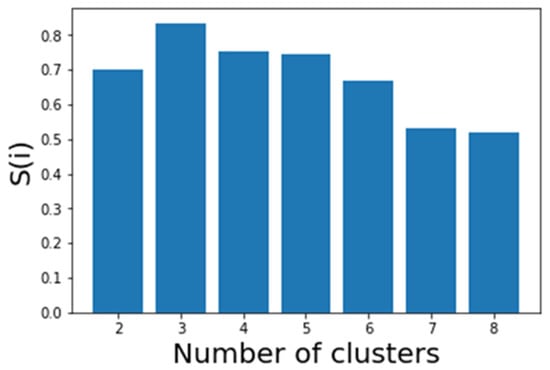 The silhouette index determines the number of clusters that would be perfect for the process. The silhouette index gives a score for the number of clusters that can be formed ranging from 1 to n, as mentioned by the user. The highest score for the corresponding n is taken as the number of clusters and given to the agglomerative clustering algorithm to split the dataset accordingly. This algorithm gives the score for the number of clusters using the mean intra-cluster distance and the mean nearest-cluster distance for each data sample. The silhouette coefficient is also defined using specific criteria [12]. The values range between 1 and −1. A slide toward a negative value indicates that the cluster was assigned with the wrong data point. Thus, eventually, the value of that cluster decreases. A positive value indicates that the sample was posted to the right cluster, whereby a value of 1 indicates that the sample was accurately assigned to the specific cluster. This method gives the average silhouette coefficient over all samples [40]. The range for the silhouette coefficient is given in Equations (3) and (4).