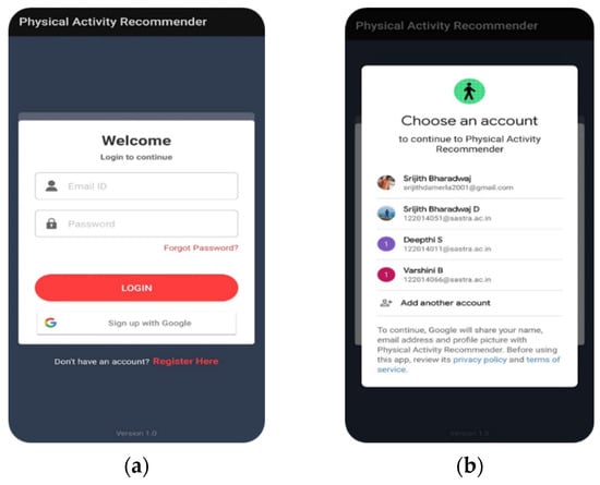 Login page of the android application: (a) welcome page with user credentials; (b) Google sign-up option for login using user’s Gmail account.