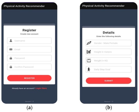 Recommended activity pattern and step count progress tracker: (a) register page of the android application; (b) user detail collection page.