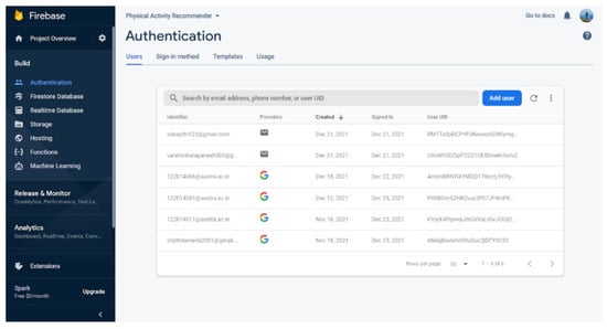 Figure 10 shows the page of the Android application where a new user can enter their details and register for the recommendation system application. When a user clicks the “Register” button, details from the text fields are stored in the Firestore database. These details are fetched when the user logs into the app. Figure 11 shows a sample view of the Firebase console after successfully registering for the application. After successful registration, the user is directed to the user detail collection page where they can enter the required details such as gender, height, weight, and daily step goal. Users are only directed to this page if their historical data are not stored in our database or in the Google fit application. Once the user submits their data, they are classified into one of the three clusters. The pretrained model is deployed in the application to classify new users. After successfully classifying the users, the most frequent activity pattern from the contextual group is used to calculate the hourly step goal on the basis of the user’s daily step goal. Figure 12 shows the recommended activity pattern of a sample user, tested using our application.