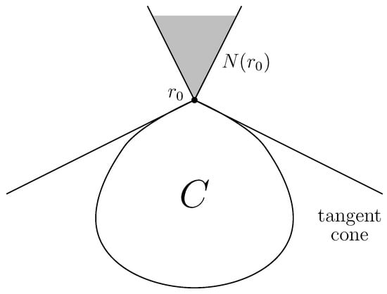 The tangent cone to C at is the closure of the union of all rays with vertex at that intersect . Equivalently, the tangent cone at is the smallest closed cone with the vertex at that contains C; see Figure 1.