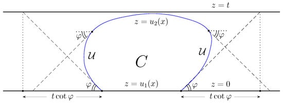 The body C is bounded below by the graph of a convex function, say , and above by the graph of a concave function, say ; see Figure 3. Both functions are defined on D. That is, we have
