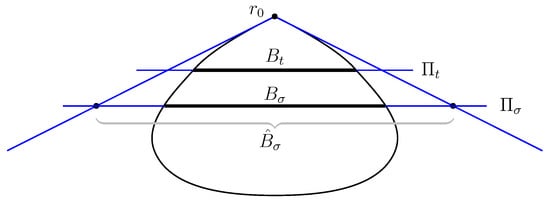 Recall that is the intersection of with the half-space and is the plane of the equation . For , denote by the part of containing the regular points r satisfying . In other words, is the set of regular points r in such that the angle between e and is greater than or equal to .