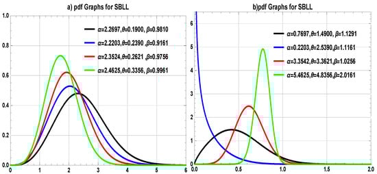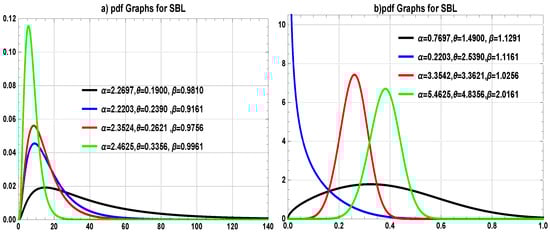 Statistical implications are usually passed through three dissimilar methods such as interval and point estimation, as well as hypothesis testing. Although numerous methodologies for parameter estimation exist in the literature, the likelihood method is the most versatile one, which enjoys anticipated chattels when fabricating the confidence regions and intervals, as well as in test statistics. The asymptotic theory of these estimates convey simple calculations that toil well in limited information contained in the samples. Statisticians frequently pursue estimating quantities such as the density of a test statistic that depends on the sample size so as to obtain better estimate distributions. The subsequent calculations for the MLEs in distribution theory can be definitely handled either logically or mathematically. In this section, we are trying to cope with parameter estimation via the MLE method from the whole sample. Let be a stochastic realization of size n from the SBX distribution given by (5). Let be a vector of the parameters. The log-likelihood function is given by
