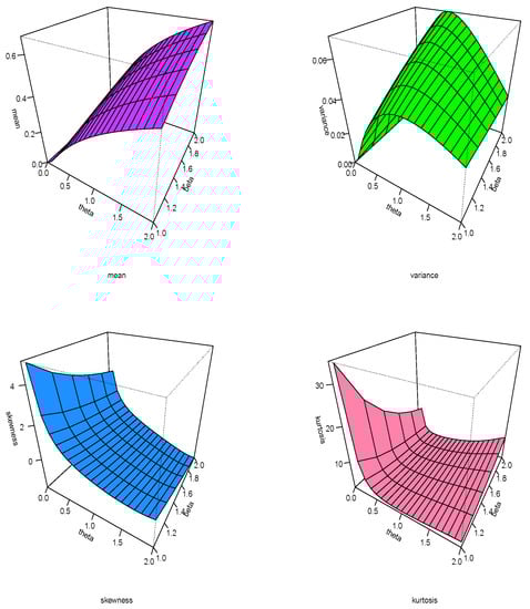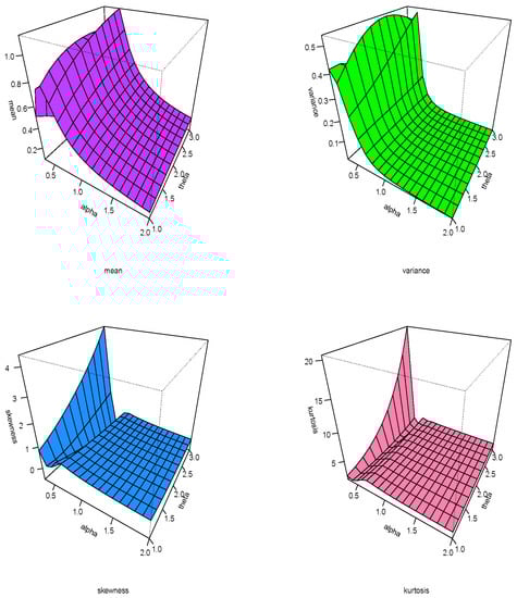 Figure 5 and Figure 6 represent the 3-D plots of the , , and of the SBXL and SBXLL distributions, respectively, for several values of parameters.