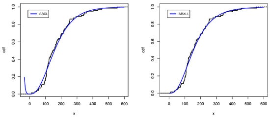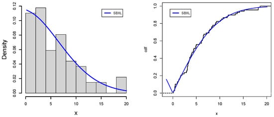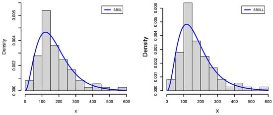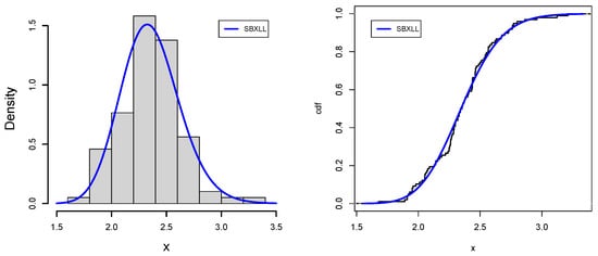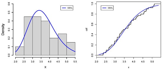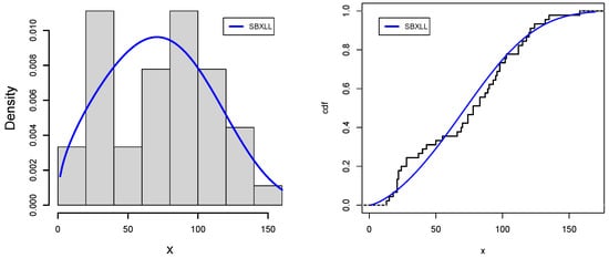 Moreover, Table 27 and Table 28 represent that for SBXL and SBXLL models, the data are displayed very well by showing minimum values of , the highest p-value of KS statistics, and the lowest values of AD and CVM, as well as the lowest loss of information behavior.