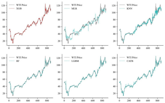 The introduction of the XGB method for oil price prediction not only improves the accuracy of the prediction, but also takes more influencing factors into account [43]. These studies on crude oil price involved making predictions using variables such as green energy resources, the stock market, and bitcoin during the COVID-19 outbreak [21,44]. The results showed that the XGB model outperformed the traditional model.