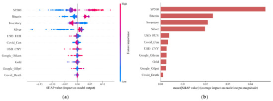 Figure 4 shows the SHAP summary plot, which ranks the selected variables according to their degree of influence on crude oil price forecasts, i.e., the higher the ranking, the more important the variable was for crude oil price forecasts. As can be seen from the graph, the S&P 500 was the most important input variable in the model. This finding supports the findings of Kyrtsou et al. [54], who concluded that the long-term relationship between the S&P 500 and crude oil price is strongly dependent through partial transfer entropy and causality tests. Moreover, it is not difficult to find that the higher the S&P 500 index, the higher the SHAP value associated with the increase in crude oil price. The same findings can be found in the article by Bouoiyour et al. [55], who argue that crude oil can be an effective hedge against volatility risk in the U.S. stock market and a safe haven against political risk for stock market participants.