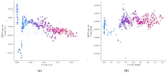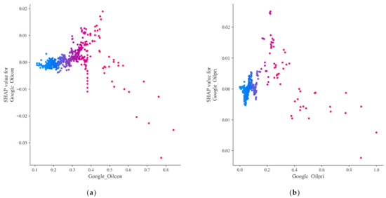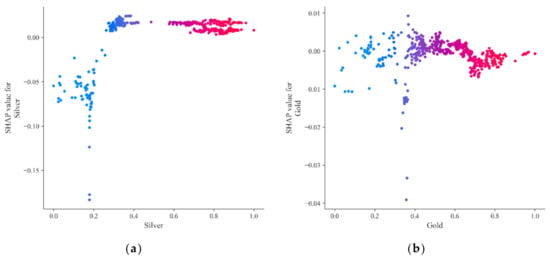 Firstly, we explored the impact of precious metal price fluctuations on crude oil price forecasts, as shown in Figure 5. In Figure 5, the red points indicate higher crude oil price and the blue points indicate lower crude oil price. From Figure 5a, we can find that when the silver price was low (within the 0–0.3 interval), the SHAP value of the low crude oil price was lower than 0, which indicates that when the silver price is low, an increase in the silver price will inhibit an increase in the crude oil price; while when the silver price gradually increased (within the 0.3–1 interval), the SHAP value of the high crude oil price was also greater than 0, indicating that when the silver price picks up, an increase in the silver price also leads to a gradual recovery of the crude oil price. As shown in Figure 5b, as the gold price rises from 0 to 1, most of the red points fall in the region where the SHAP value is less than 0, indicating that an increase in the gold price suppresses an increase in the crude oil price. The above finding is in line with the findings of Bouoiyour et al. [55] and Selmi et al. [56], which concluded that gold is an effective hedge against crude oil price volatility as a financial asset.
