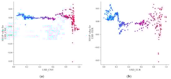 Second, we discuss the impact of exchange rates on crude oil price forecasts, as shown in Figure 6. Figure 6a shows the effect of a change in the U.S. dollar against the RMB on the volatility of the crude oil price, and it was found that when the RMB point was low (less than 0.2), the SHAP value at this time was always positive, indicating that when the RMB point is low, an increase in the RMB exchange rate has a positive contribution to increasing crude oil price. Figure 6b shows the effects of the change in the USD–EUR exchange rate on the volatility of the national crude oil price. Similarly, it can be observed that the SHAP value was always positive when the USD–EUR exchange rate was low (less than 0.2), indicating that an increase in this exchange rate has a positive impact on the improvement of crude oil price when the USD–EUR exchange rate is at a low level.