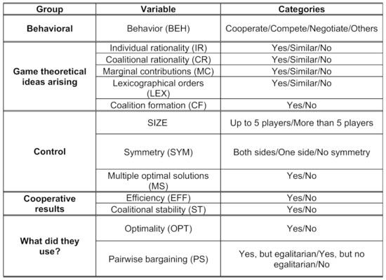 In the first column of Figure 1, we show the five groups of variables we have considered. The first group, behavioral, only has one variable, behavior. This variable shows what kind of behavior was used by the students when facing the problem of distributing the pie among them. The second group, game theoretical ideas arising, consists of five variables, one for each of five cooperative game theory concepts. In this case, all variables have three categories, except one that is dichotomous. These variables indicate whether these concepts were used in some way. The third group of variables is control, which is made up of variables whose values do not depend on what the students do, but on the design of the problem that has been proposed to them. The fourth group of variables evaluates if the distribution obtained has any property related to properties of distributions in cooperative games. In particular, two variables related to the concepts of coalition efficiency and stability are observed. The last group of variables has to do with what the students used to reach a final distribution of the benefit generated. In this case, two variables were observed that measured whether they had used optimal solutions and pairwise bargaining to achieve a benefit distribution. Each variable category is explained in more detail below.