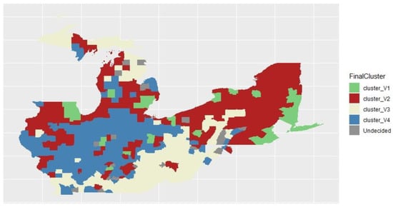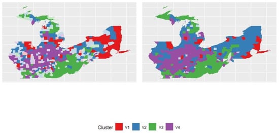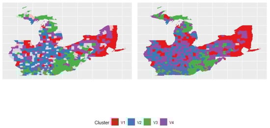 The results indicate that the GFCM provides a less fuzzy solution (with higher explained inertia and lower partition entropy), but keeps a good silhouette index and a lower Xie and Beni index. The study created two membership matrices maps and the most likely group for each observation. The study used the function map clusters from geocmeans in R language. We set a threshold of 0.45. If an observation only obtained values below this probability in a membership matrix, it was marked as “undecided” (represented by transparency on the map).