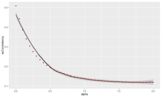 The study chose the best alpha value in order to reduce spatial inconsistency as much as possible and to maintain a good classification quality. The relationship between the spatial inconsistency and alpha value is shown in Figure 3.