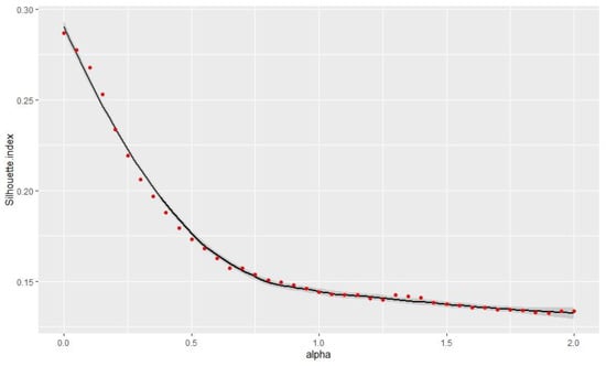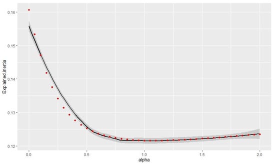 In Figure 4, the explained inertia decreased when the alpha value increased and again followed an inverse function. The classification searched for a compromise between the original and lagged values. However, the loss was only 3% between alpha = 0 and alpha = 2.