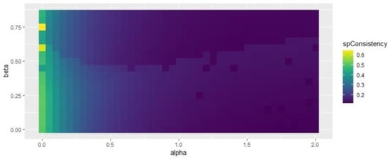 Figure 7 and Figure 8 indicate that some specific combinations of alpha and beta values generate good results in the range of 0.3 < alpha < 0.7 and 0.4 < beta < 0.6. Figure 9 shows that the selection of beta has no impact on spatial consistency.